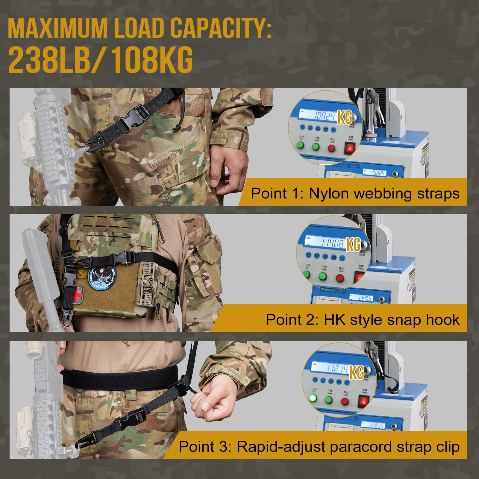 • 【2ポイントライフル用スリング】ナイロンストラップやスナップフックを介してあらゆるタイプのライフルをモジュラー接続でき、クイックアジャストパラコードウェビングクリップにより片手で素早く調整可能。