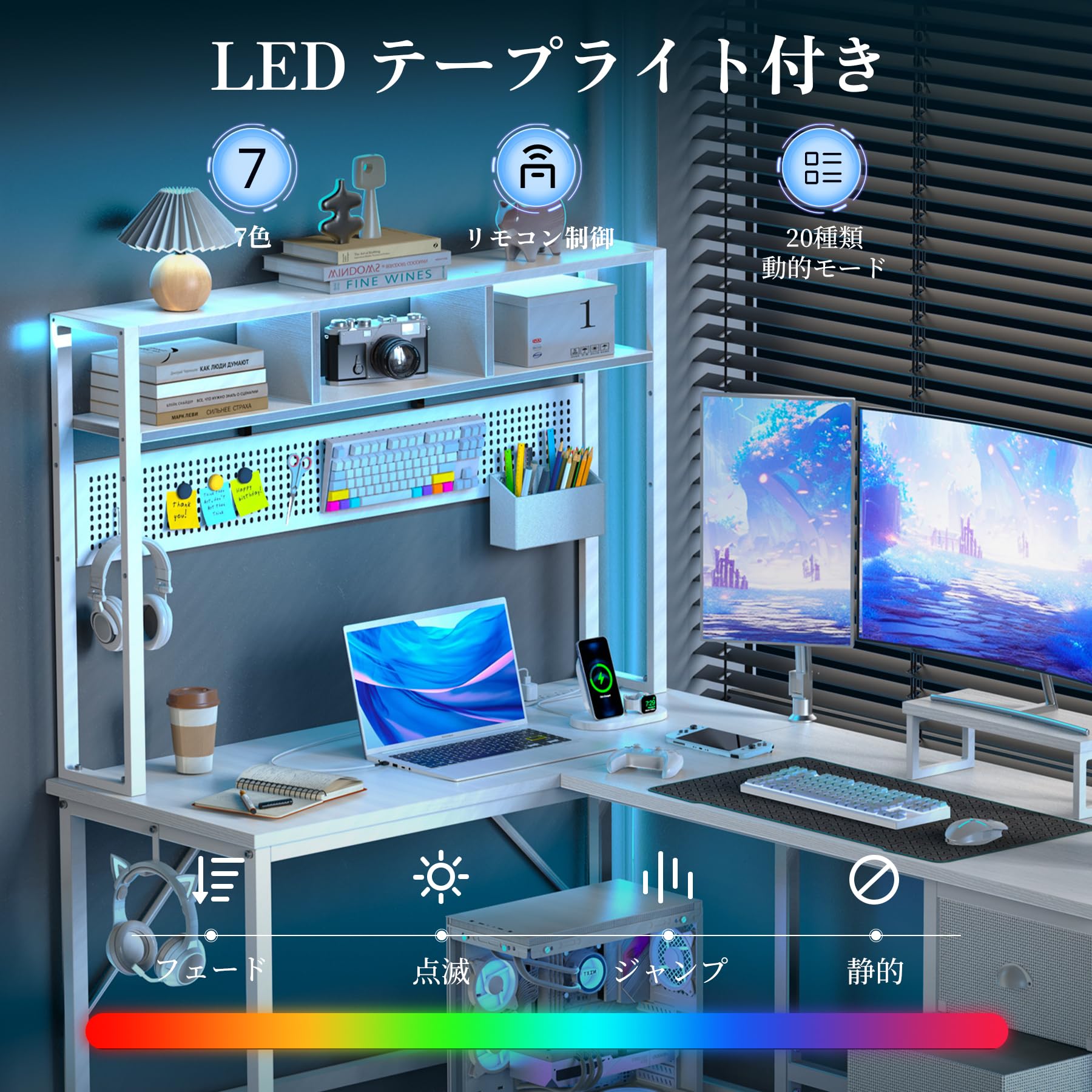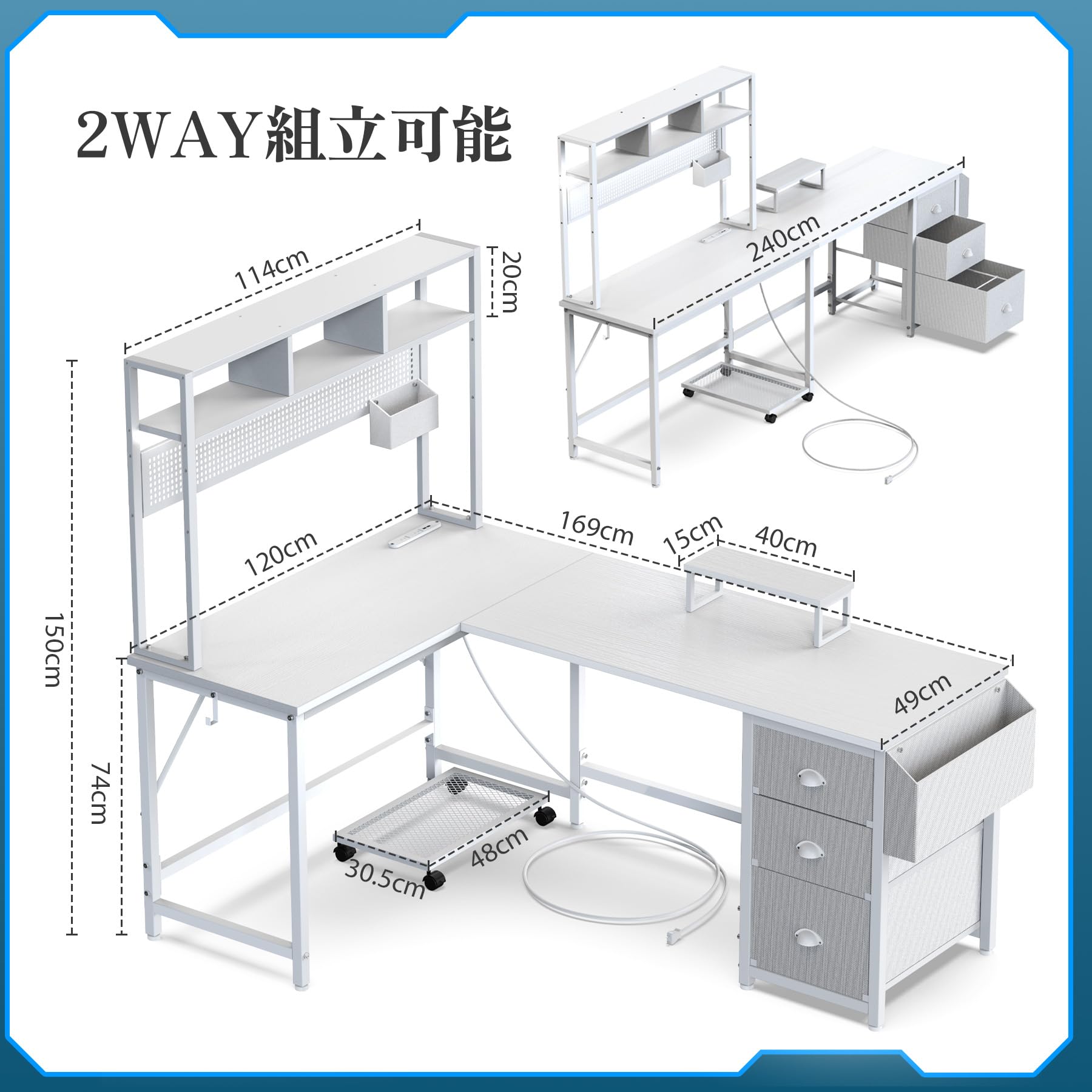 L字デスク パソコンデスク 白 幅169cm 引き出し/有孔ボード/コンセント付き 棚 収納 ゲーミングデスク PC ですく computer desk 桌子 オフィス用 学習机 作業机 コーナーデスク 在宅勤務 組立簡単 (ホワイト, 幅169CM)